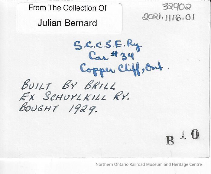 Car #34 was purchased in 1929 by the Sudbury Copper Cliff Suburban Electric Railway. It was built by Brill and originally used by the Schuylkill Railway.Collection