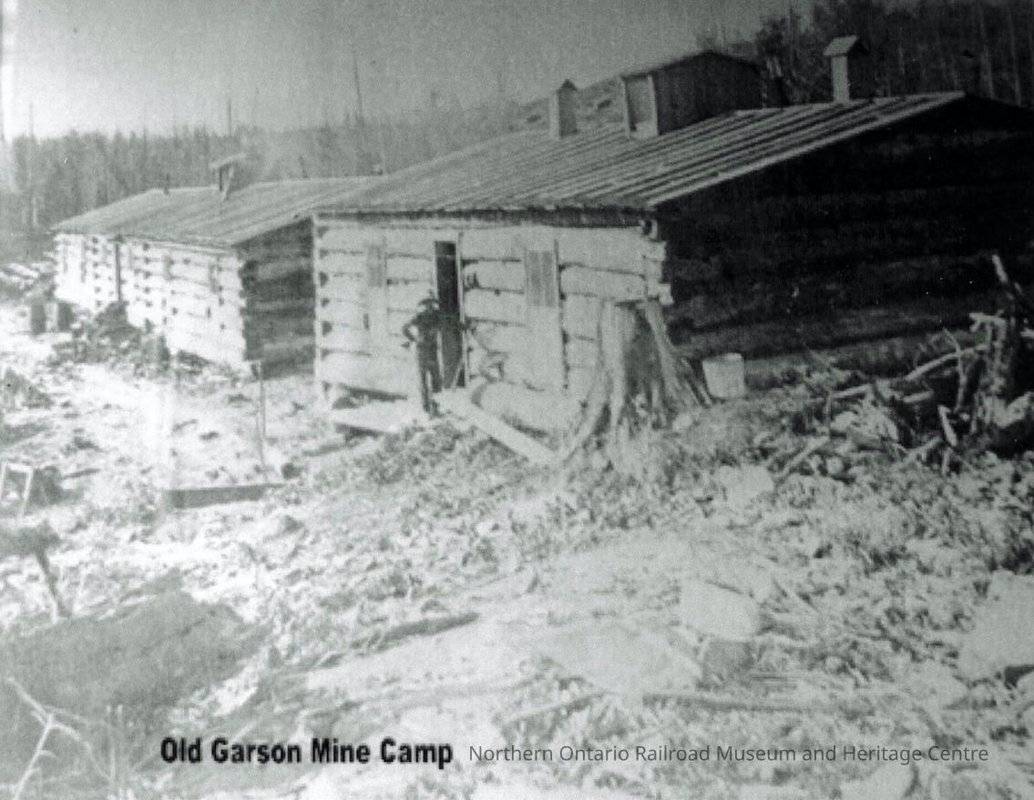 Black and white digital reproduction of a photograph of the old Garson Mine camp. The image shows two log cabins. A man stands in the doorway of the first cabin. Image quality is poor.