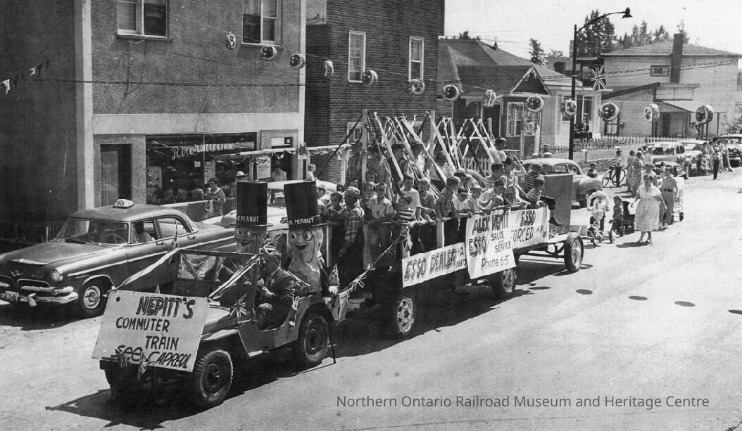 Black and white- "Nepitt's Commuter Train" (a Jeep pulling a flat trailer) drives down a Capreol Street, near River's Electric. On the back are a number of children. Beside the commuter train is a taxi. Attached to the back of the Jeep are massive statues of Mrs. and Mr. Peanut.Collection