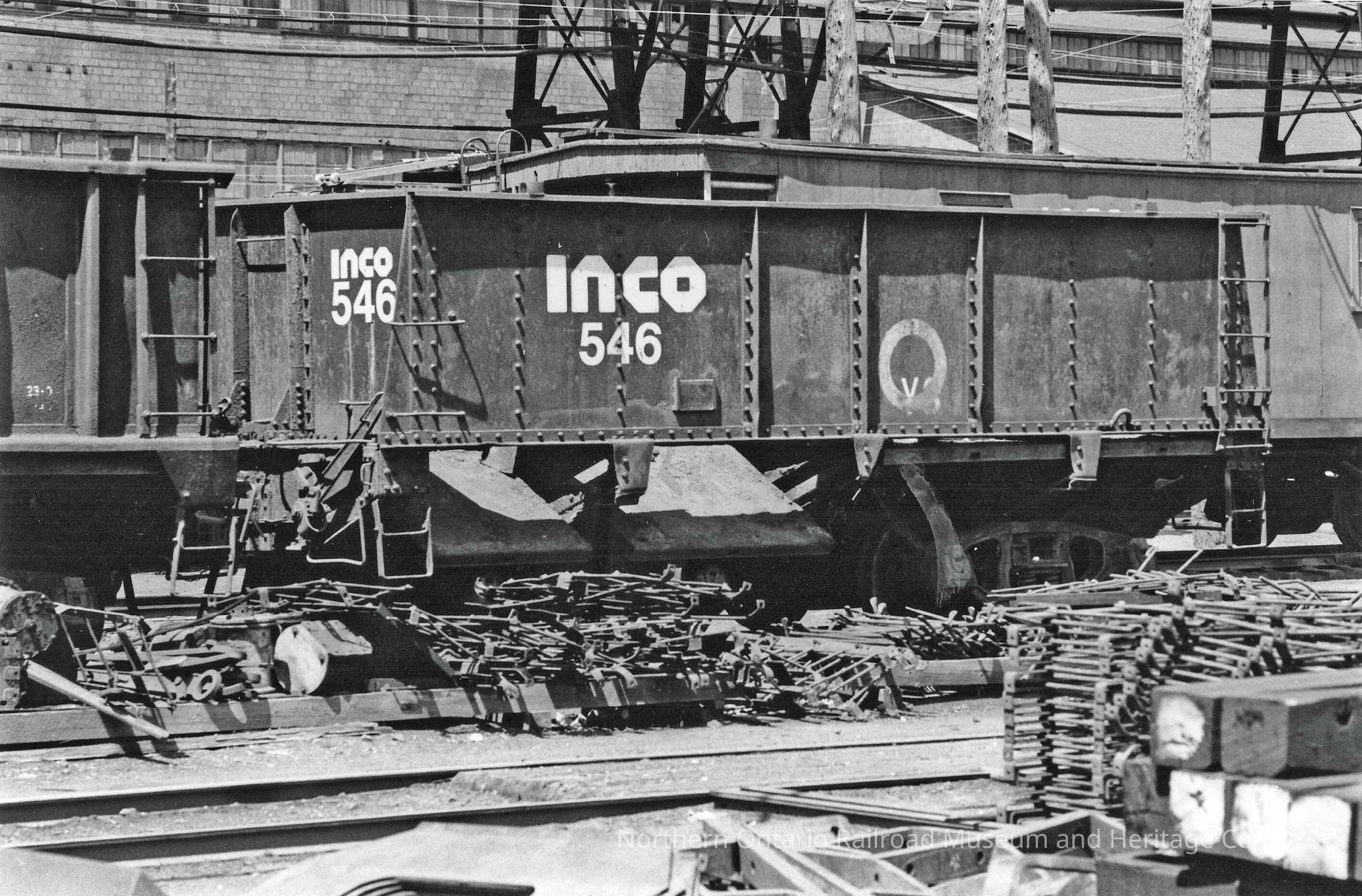 Black and white photograph of INCO ore car #546. Shows dumping process.Collection