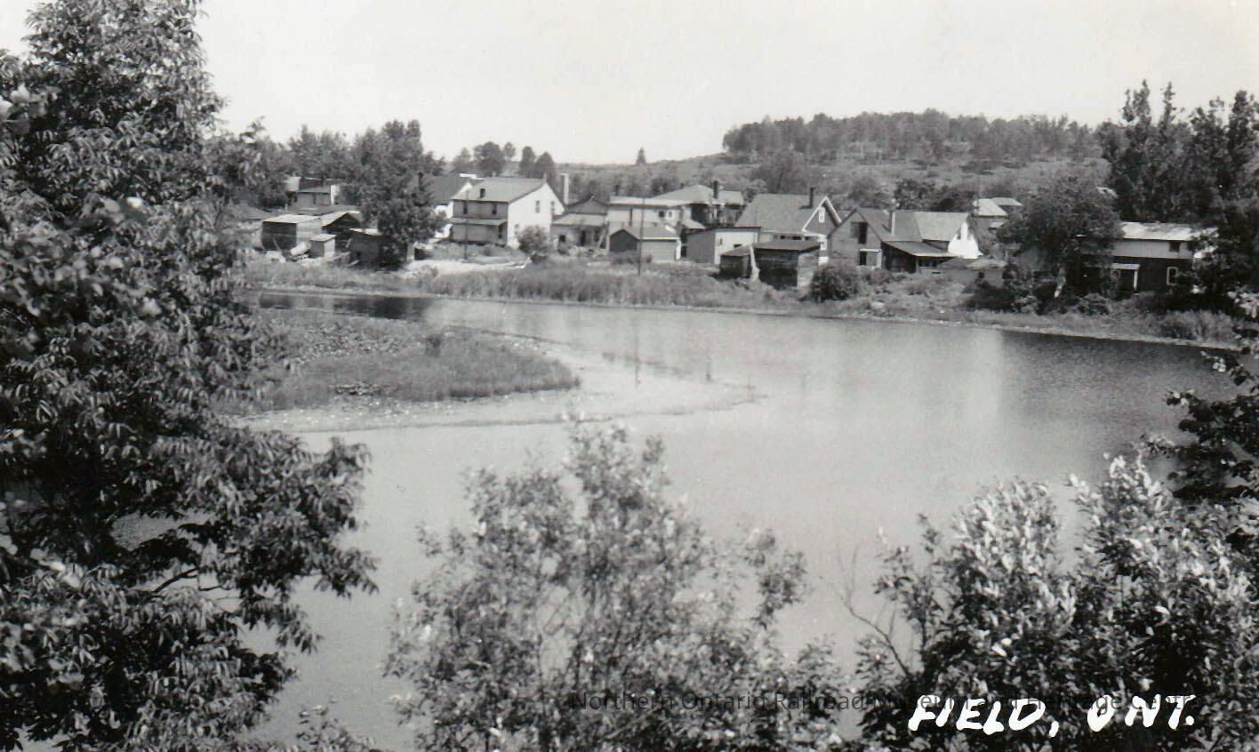 Digital scan of a black and white photograph of a river in Field, Ontario. Trees and shrubs line the immediate foreground. Houses are visible on the shore of the river in the middleground.Collection