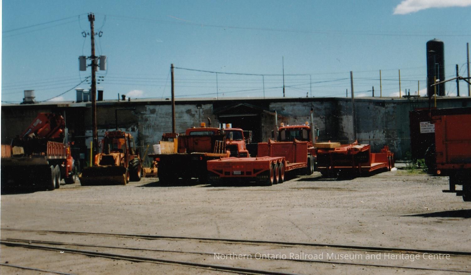 Colour photograph of four trucks and one tractor parked outside a garage in an unidentified railyard. Trucks and tractor are orange. One orange trailer parked to the right of the trucks.