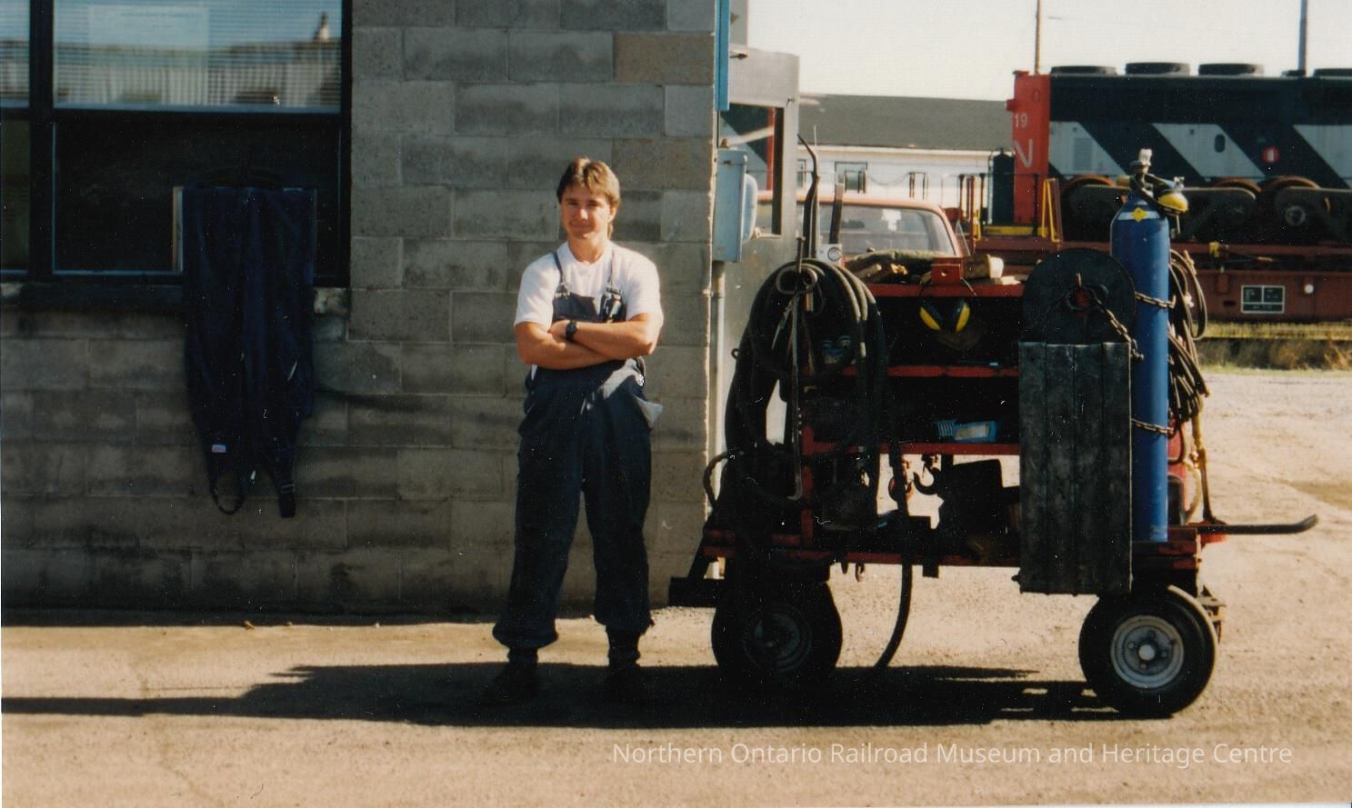 Colour photograph of Pat Foucault standing in front of a wall made up of cinder blocks. He is wearing coveralls, standing with his arms crossed, beside a cart with hoses draped on it. CN locomotive in the background in the upper right corner.