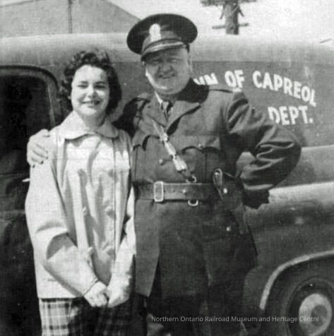Black and white reproduction of a photograph of Capreol police chief Mr. MacAtee standing in front of a vehicle with his arm around Pat Fawcett.Collection