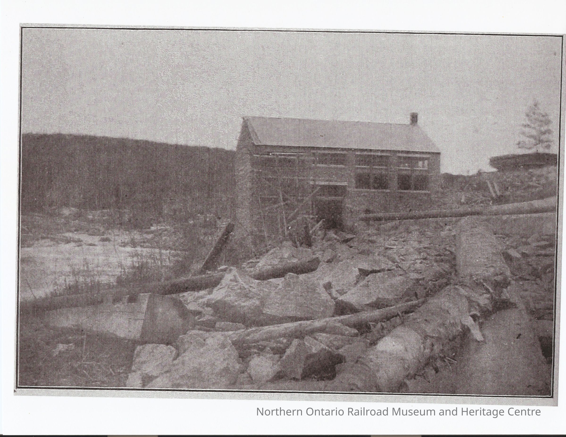 Good quality photocopy of an original photograph of the power house of the Sudbury Power Co., McPherson Falls, Vermillion River, Creighton Township. The power house stands near the center of the image with large rocks and logs and in the foreground.
