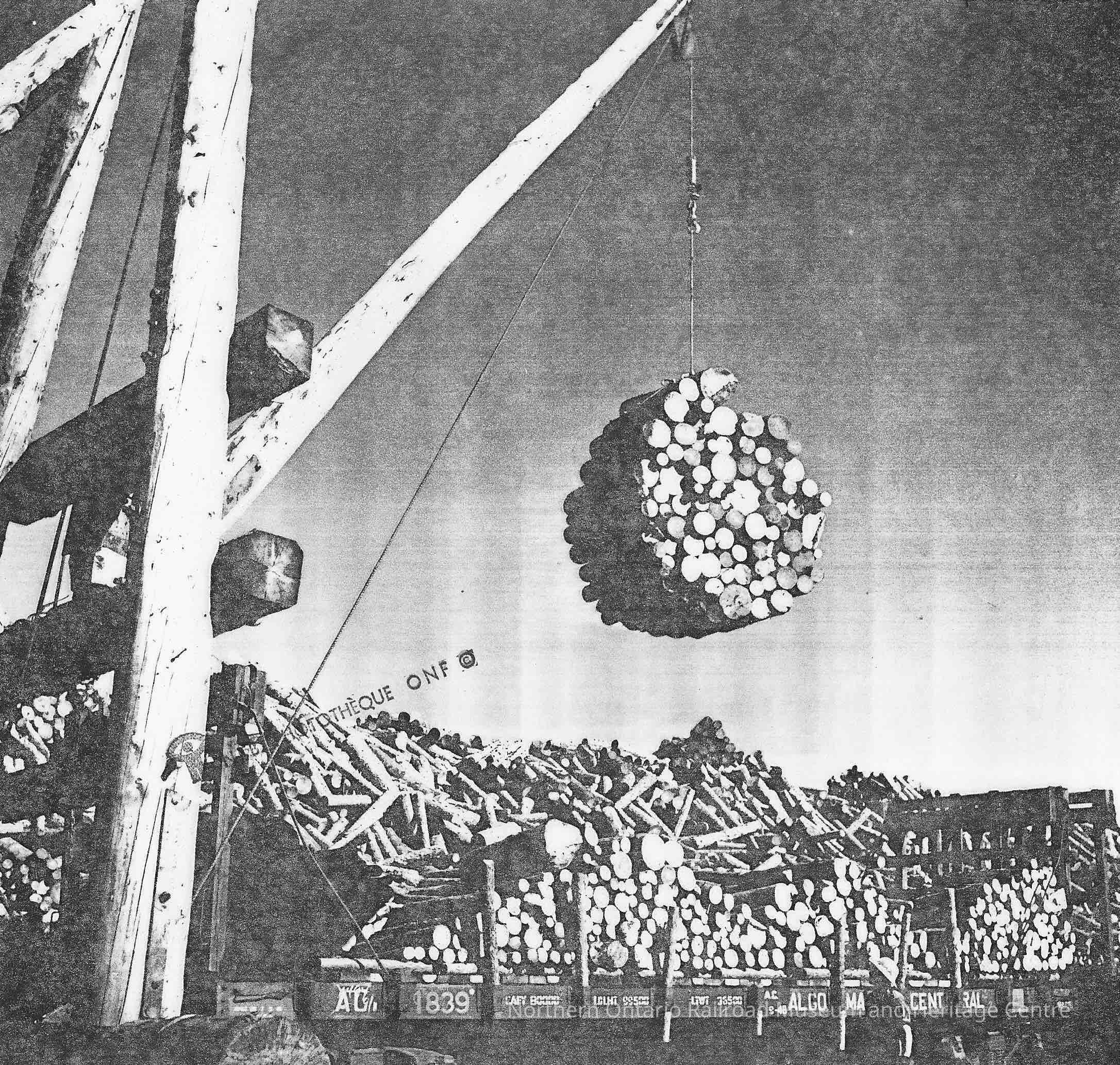 Photocopy of a photograph of pulpwood being loaded onto flat cars at Hanson, Ontario for Northern Paper Mills Ltd. in 1948.