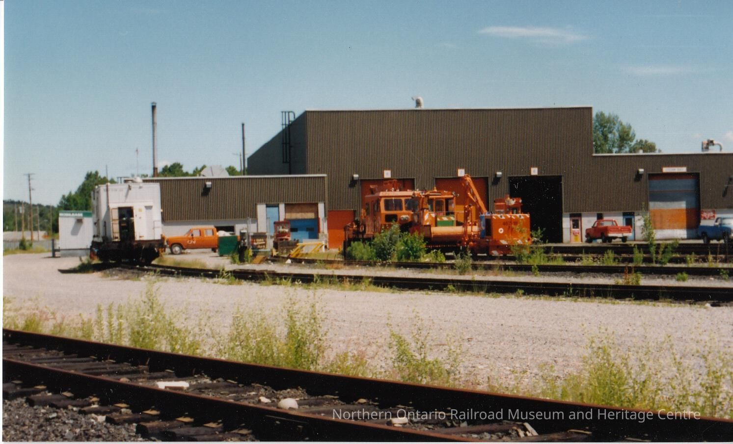 Colour photograph of rail service vehicles in front of a garage in an unidentified railyard. Tracks cross the photo horizontally along the bottom edge. Garage in background with four bay doors. One door is open (third from the left). Rail service vehicles in front of doors (possibly a snow removal vehicle).