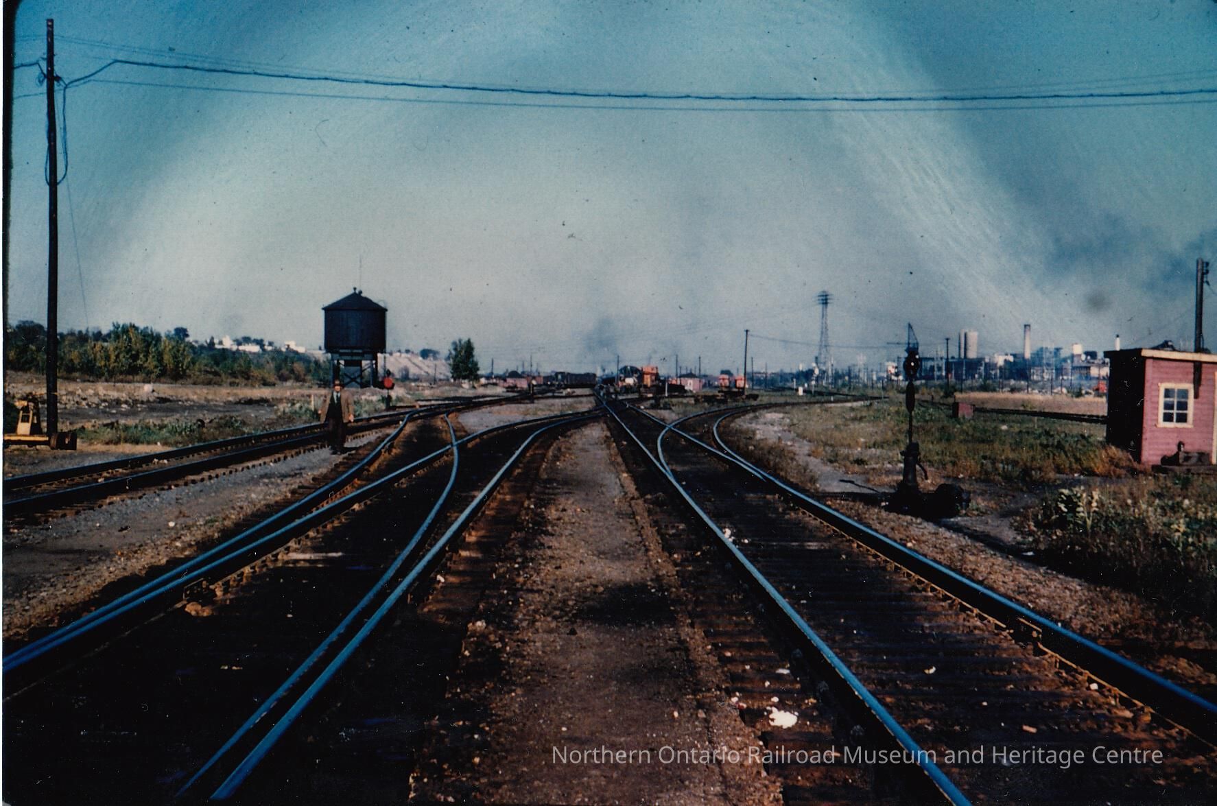 Colour- A photograph depicting the Sudebury rail yards. Two of the tracks leading into the railway station branch into two different paths. Along one of the tracks walks a man wearing a suit, coat, and hat. In the background is a massive industrial complex.Collection