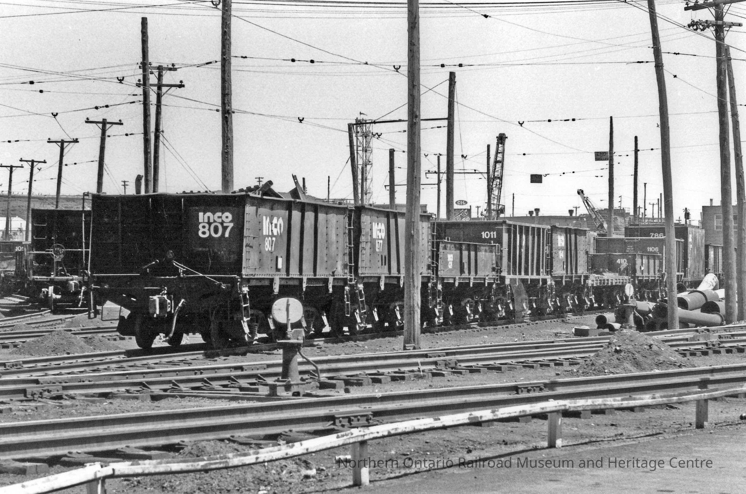 Black and white photograph of rolling stock variety. INCO railroad cars in a railroad yard. Front car is stenciled with INCO 807.Collection