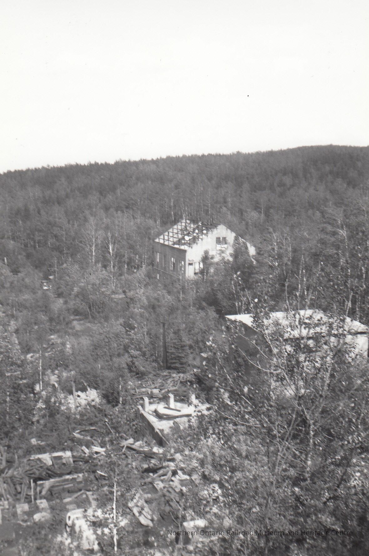 Black and White- A large, roofless building stands amidst a forest. In the foreground are several foundnations, and another abandoned flat-roofed building.Collection