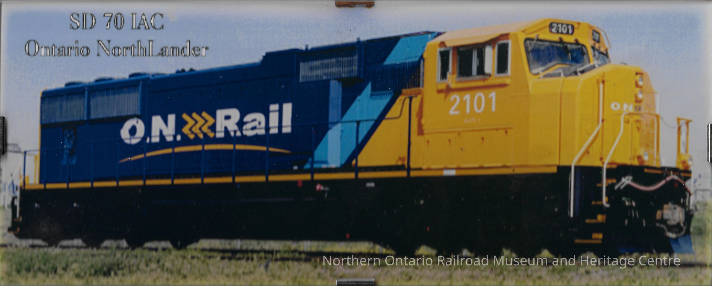 A colour photograph of SD 70 LAC Ontario Northlander, locomotive # 2101. Mounted on a stiff board with for metal clips and a thick glass cover.Collection