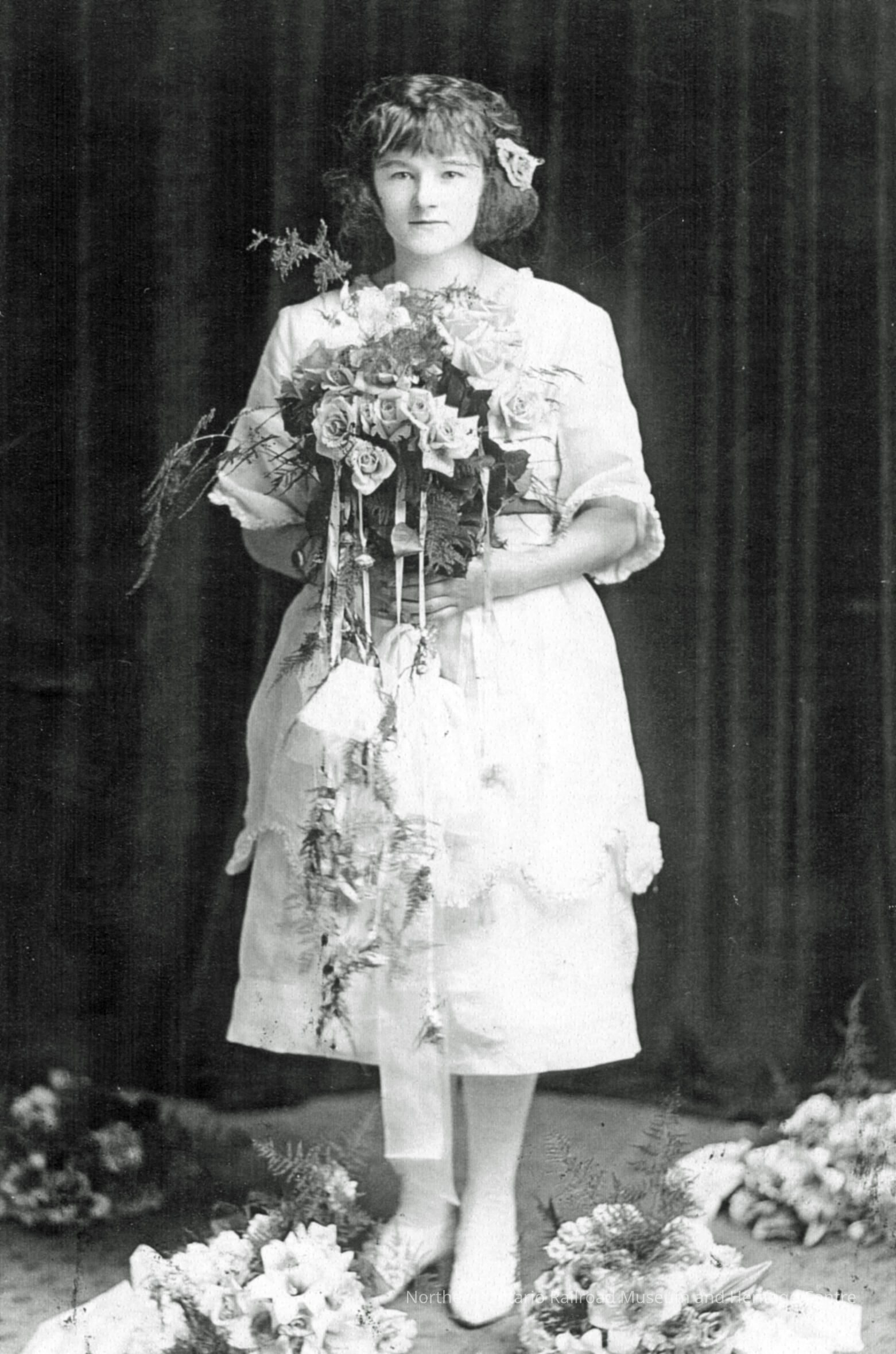 Black and White- A bride [?] holding a bouquet of flowers poses for a photograph.Collection