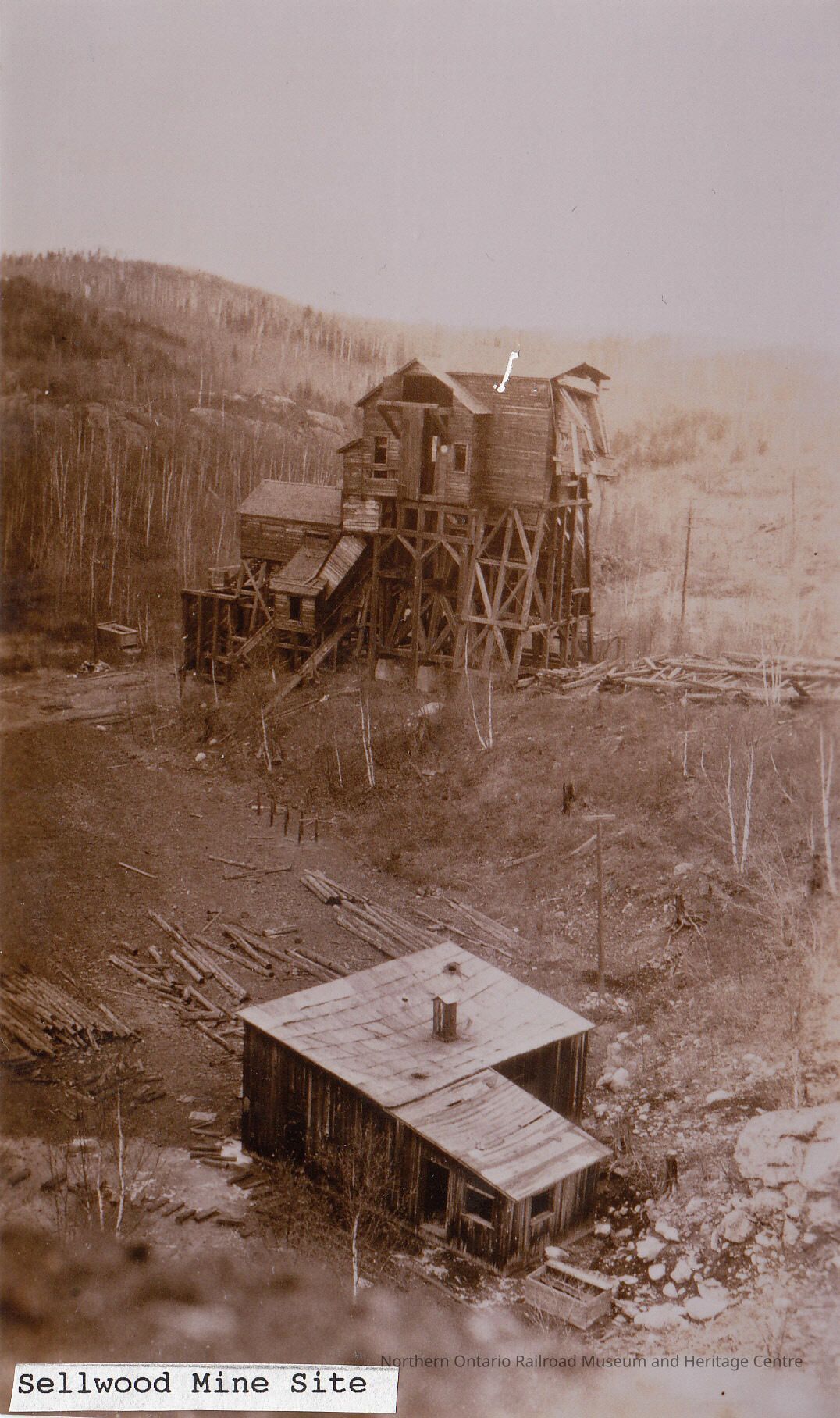 Black and White- A photograph of what remains of the Sellwood Mine site. Its headframe, built of wood for the most part, is broken down, unstable, and unmaintained. Several logs litter the mine site, and an abandoned outbuilding with a tin roof decays along with the rest of the mine.Collection
