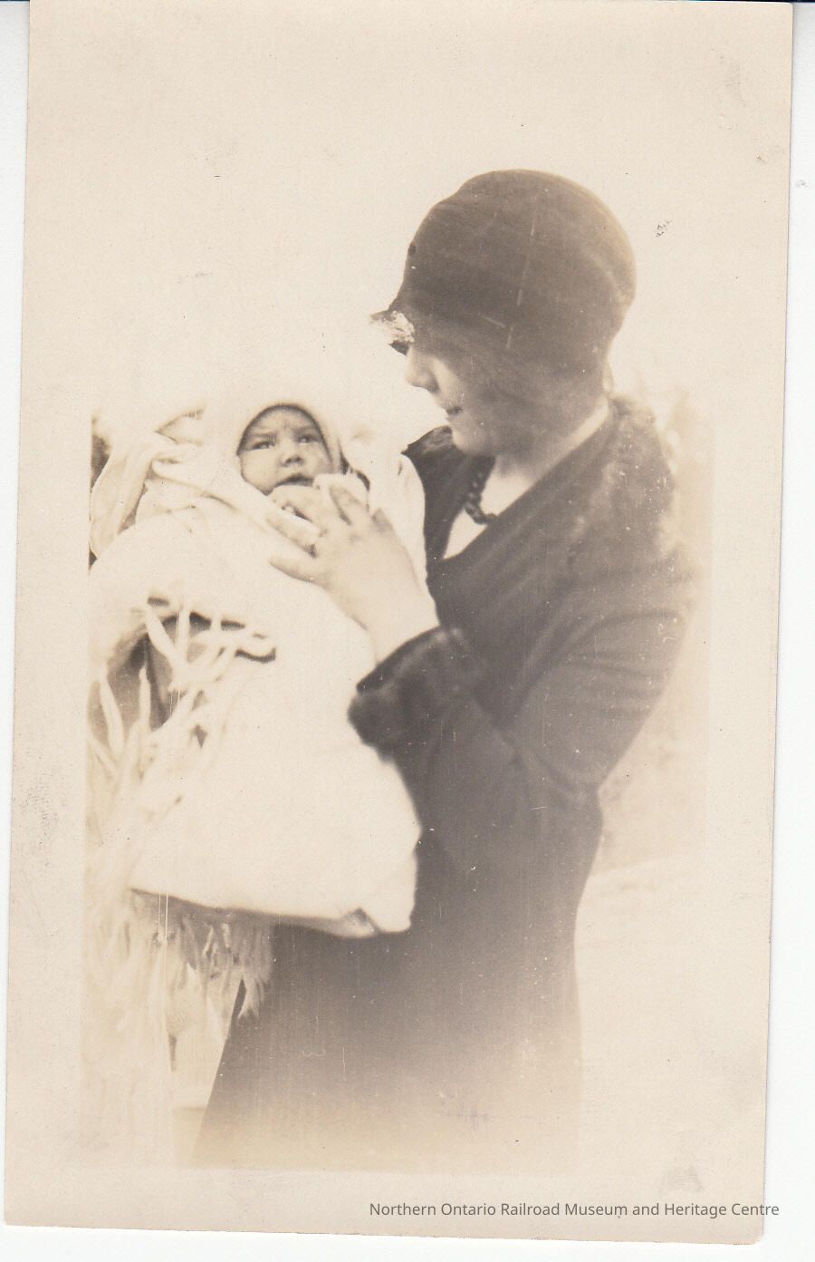 Black and White- A bonneted woman holds and tries to soothe her crying infant, who is wrapped in a white blanket and is wearing a white cap.Collection
