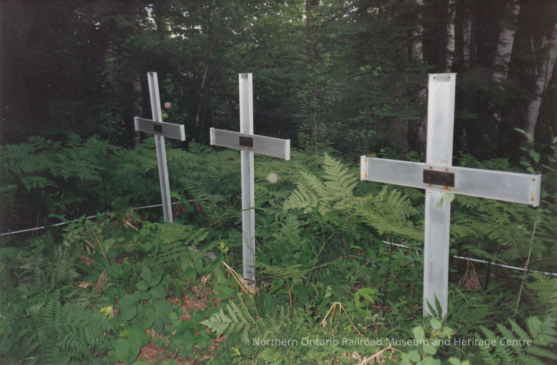 Colour- Three crosses stand amid ferns to mark three graves belonging to members of the Shpaiuk and Jaworski families.Collection