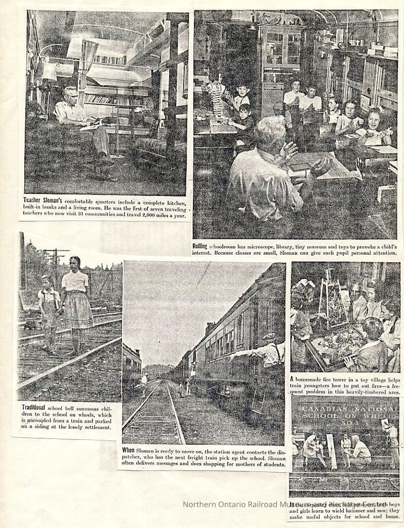 Digital reproduction of six images of teacher Fred Sloman teaching children on the school car.