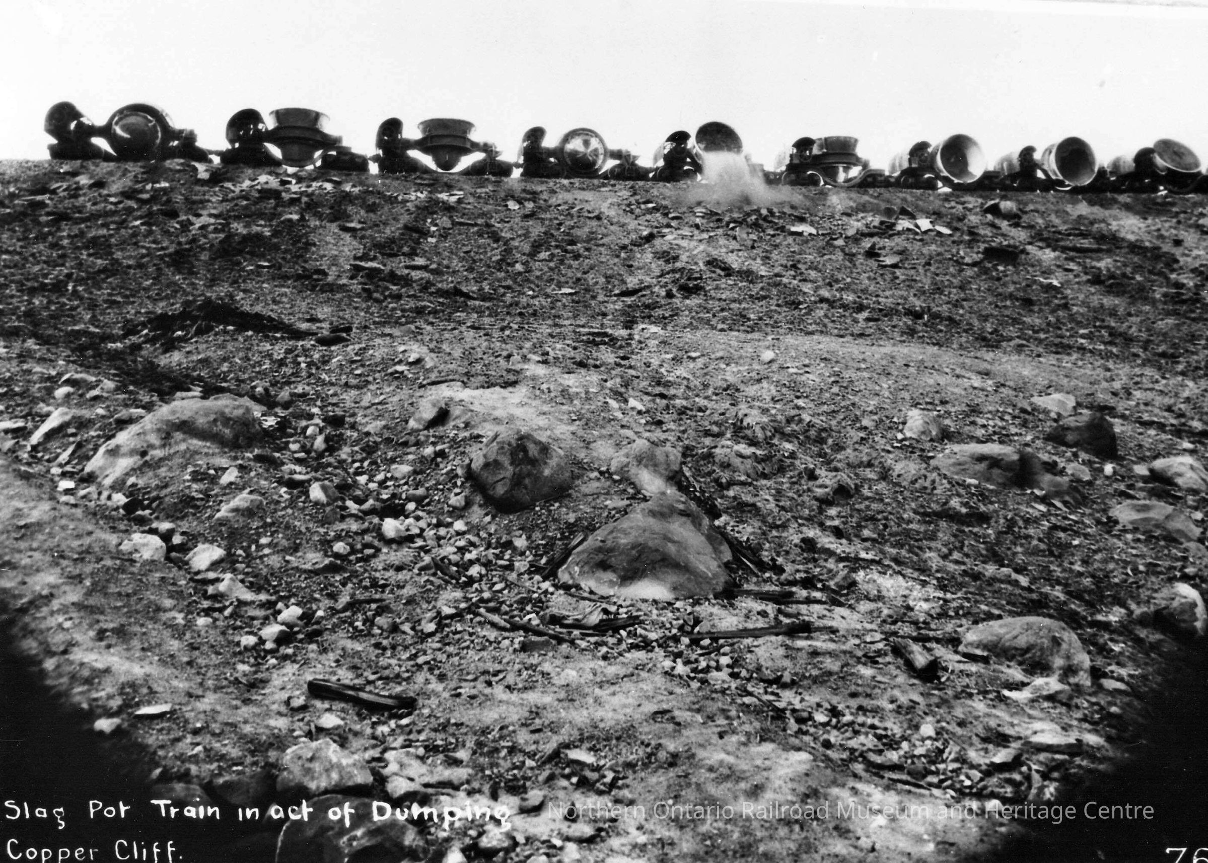 Slag pot train in act of dumping, Copper Cliff, Ont.