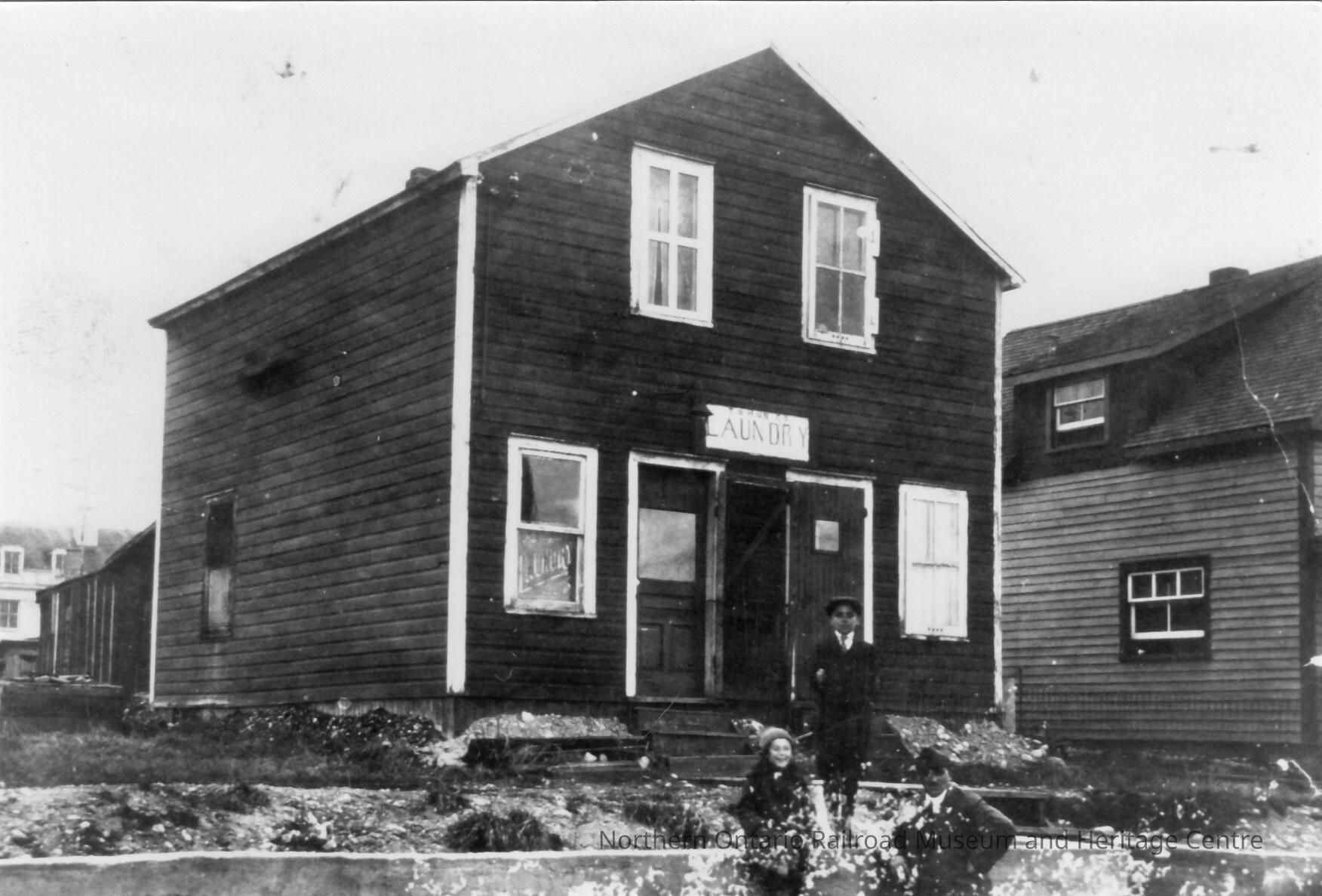 Black and White- Three young people pose in front of the Son Sam Hop Top Chinese Laundry on Young Street in downtown Capreol in 1924.Collection