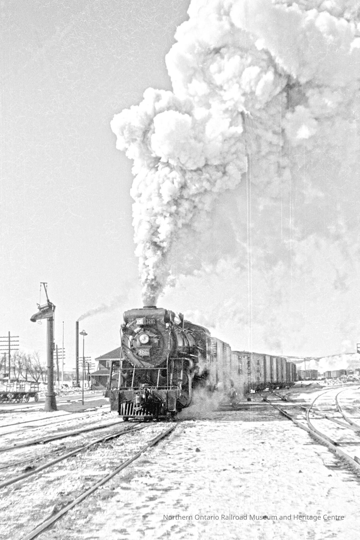 Digital reproduction of a black and white photograph of a steam locomotive in the Capreol yard.