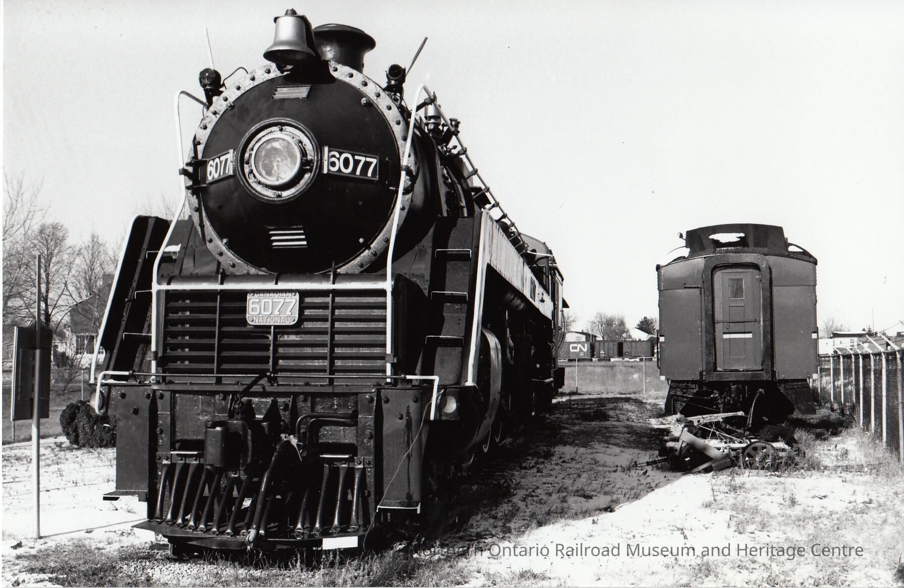 Black and white photograph of steam locomotive no. 6077 in Prescott Park.