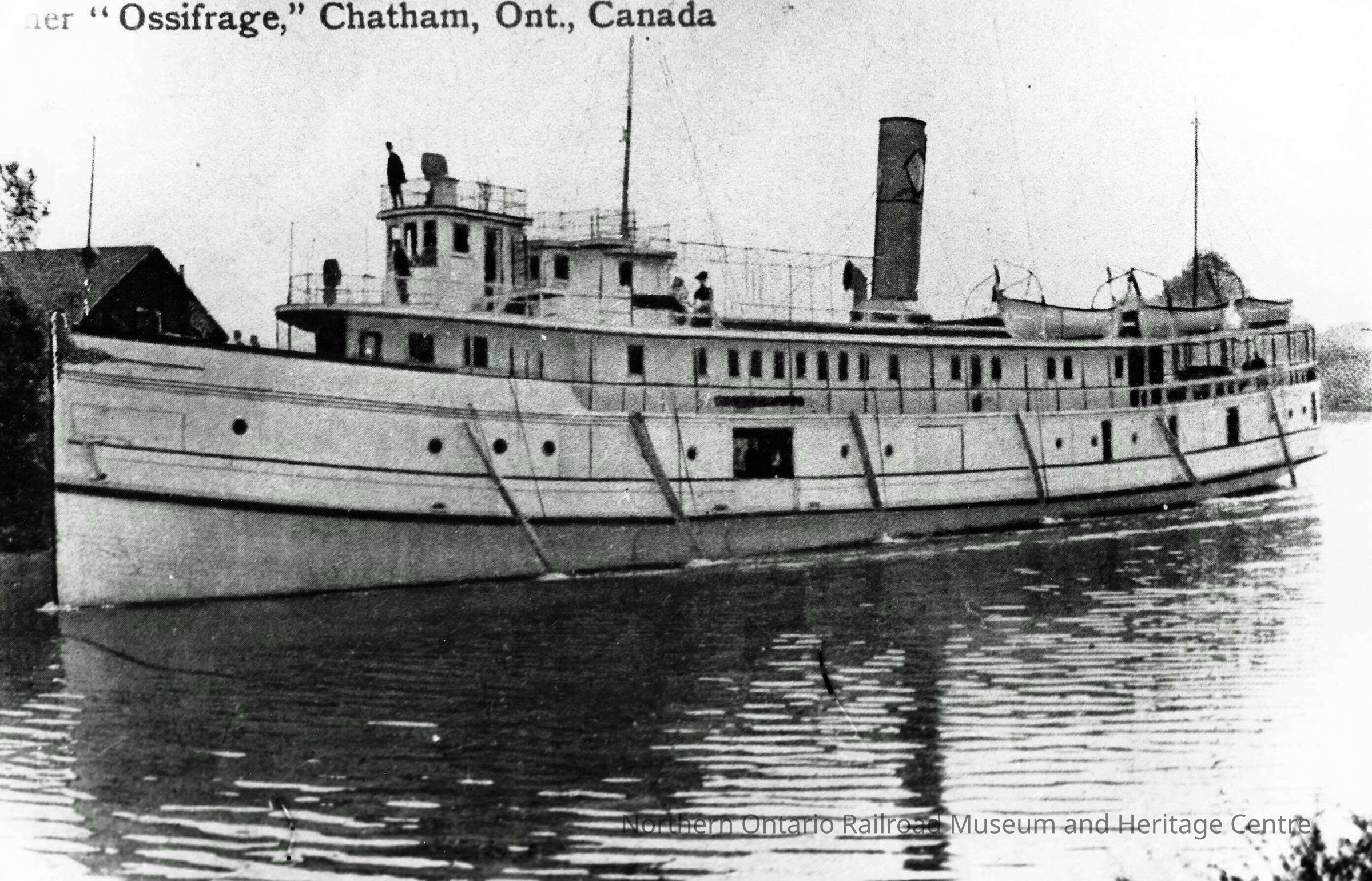 Black and white photograph of the steamship Ossifrage in Chatham, Ontario, Canada. Ossifrage was an early passenger steamer owned by Algoma Central steamship division