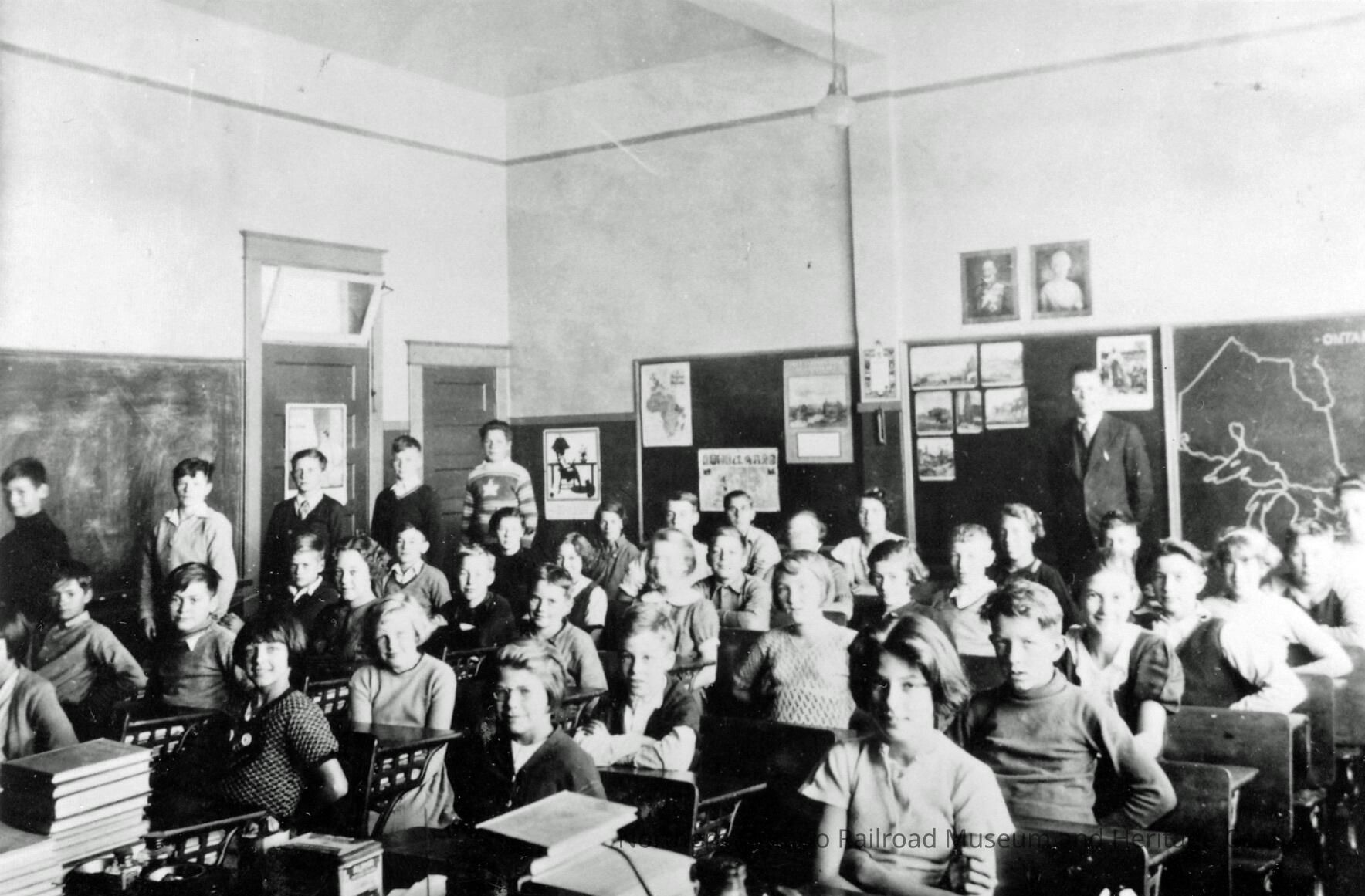 Black and White- A group of students sits at their desk. Several stand to their right, including one wearing a hockey jersey bearing a stylized maple leaf. On the board at the back is a map of Ontario. Stewart Armstrong (teacher) and class.Collection