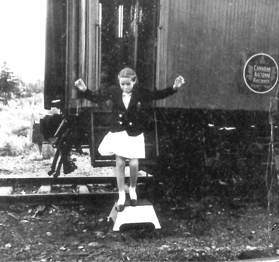 Digital reproduction of a black and white photograph of a young female student stepping off the Sloman Canadian National Railways school car. She wears a dark blazer over her pale dress, with ankle socks and dark shoes, her arms outstretched as she hops down.