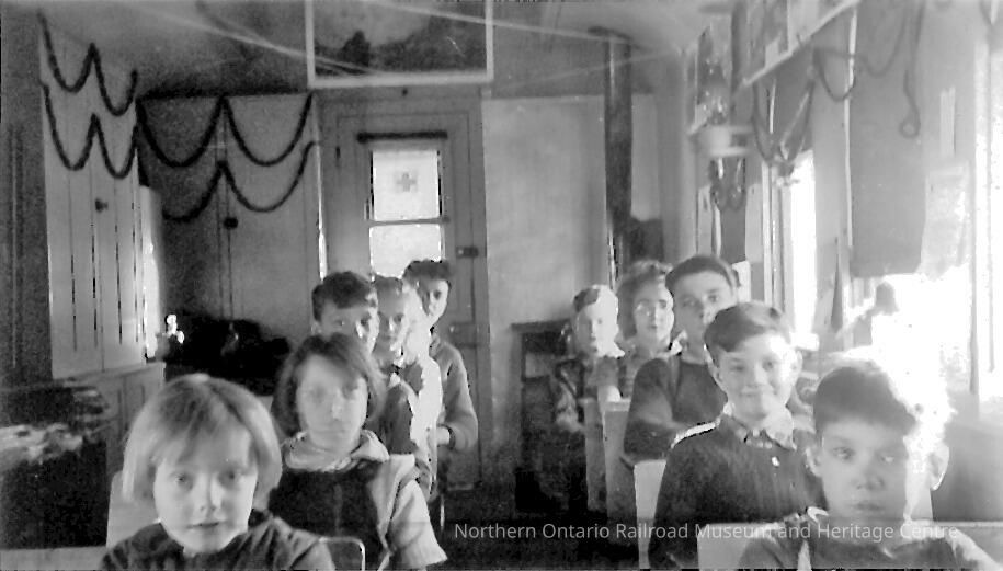 Digital reproduction of a black and white photograph of younger students seated at their desks inside the McKay Canadian National school car.