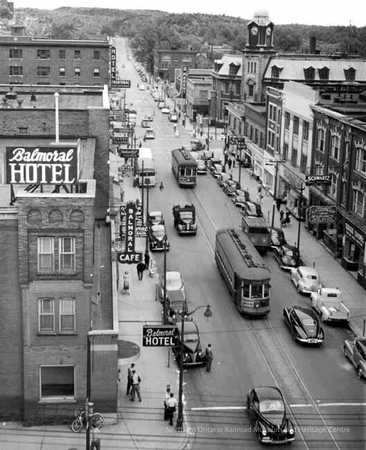 Photograph, Sudbury, Elm Street with Streetcar and Balmoral Hotel, 1940s.Collection