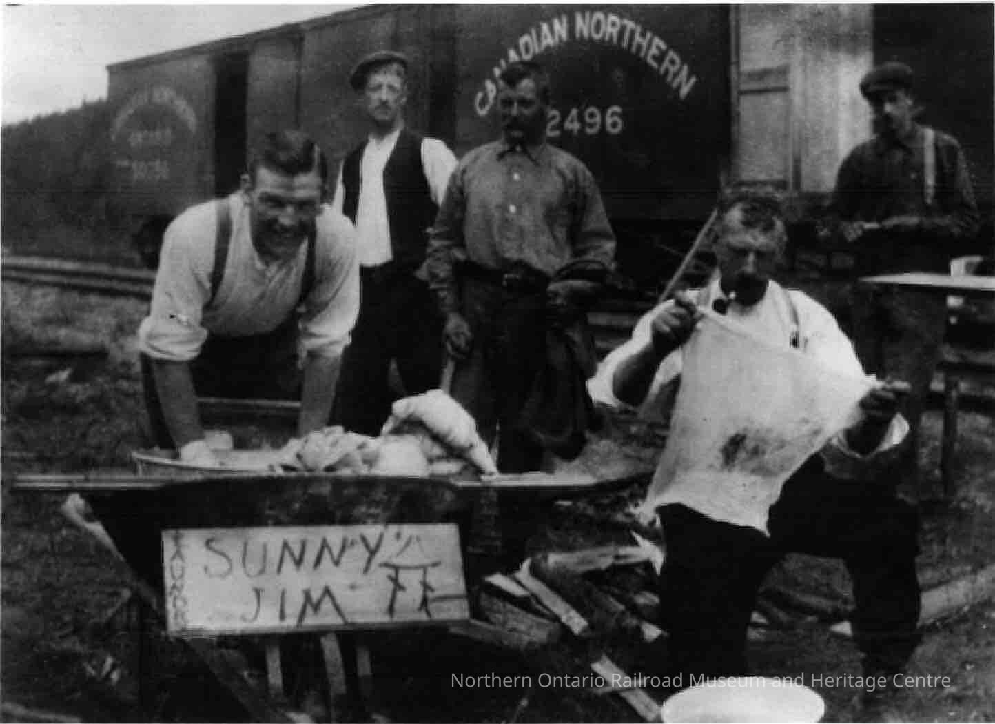 Photograph of five men, two in the foreground, two behind, and one a little distance to the right. Sign at front says "Sunny Jim Laundry". Canadian Northern 2496 car behind. Black and white photoCollection