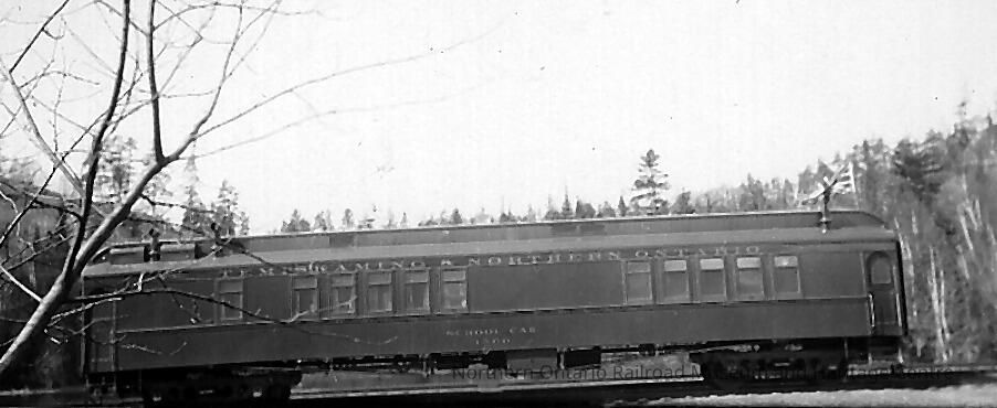 Digital reproduction of a black and white photograph of the Temiskaming and Northern Ontario school car 1500.