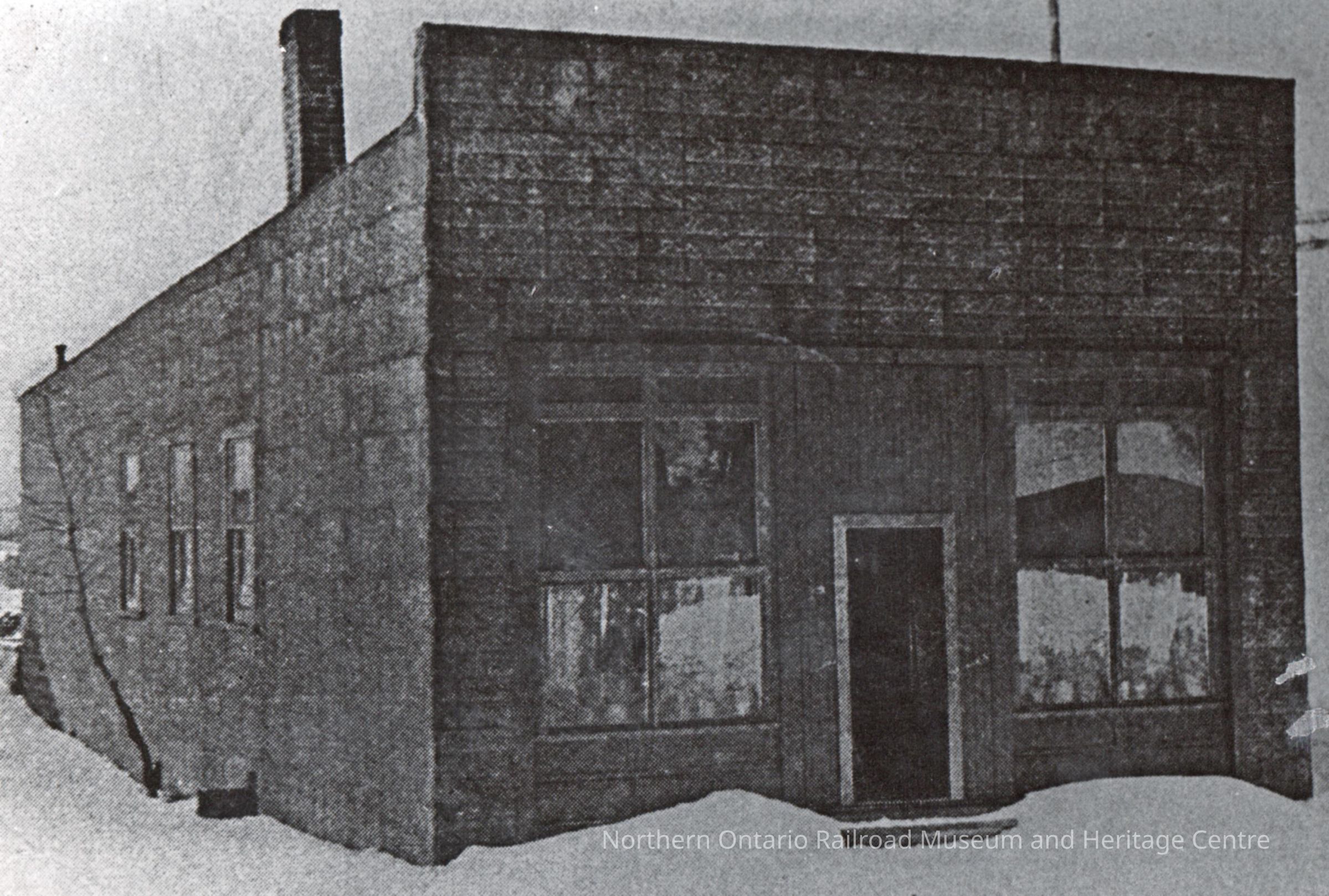 Black and white- A winter photo depicting the First Continuation School in Capreol. It is a small, wooden building with a brick chimney.Collection