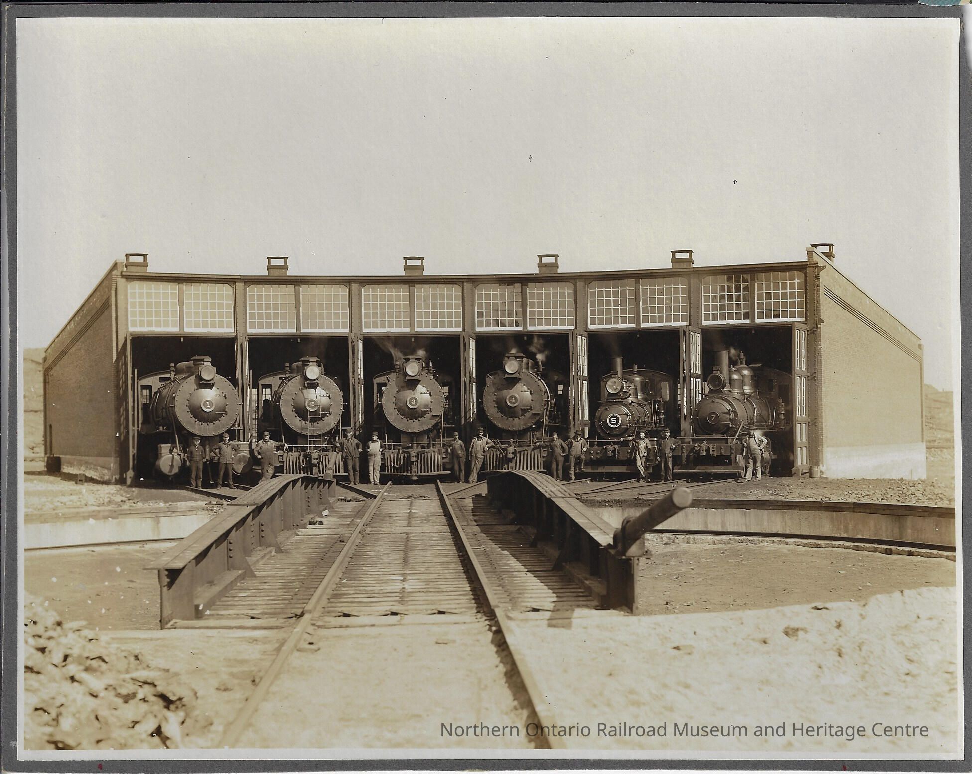 Sepia coloured photograph showing International Nickel Company of Canada's roundhouse in Copper Cliff, Ontario. There are six steam locomotives in the stalls and a total of 12 workers posing next to the locomotives.Photograph Details