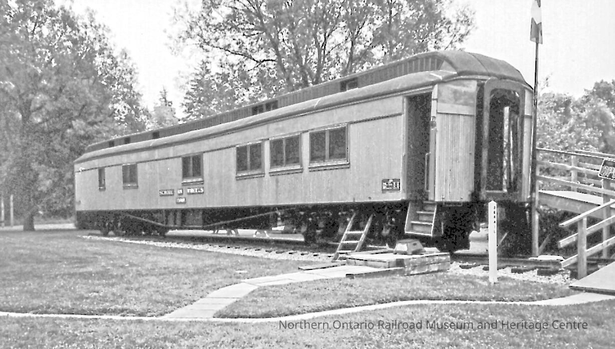 The CN "School on Wheels" program travelled along the CN track in Northern Ontario between Capreol and Foleyet for 39 years. Fred Sloman had one of the longest teaching tenures on the school car. This car has been preserved and set up as a museum in Clinton, Ontario.Collection