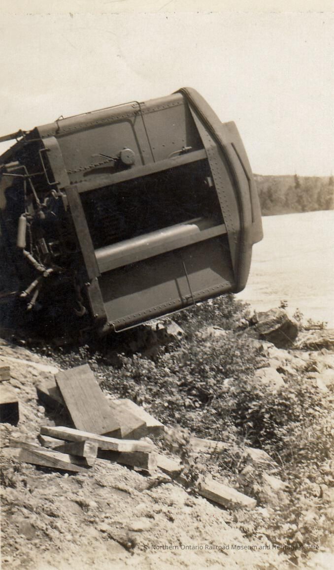 Black and white- A single car lays derailed beside a body of water. It is completely on its side.Collection
