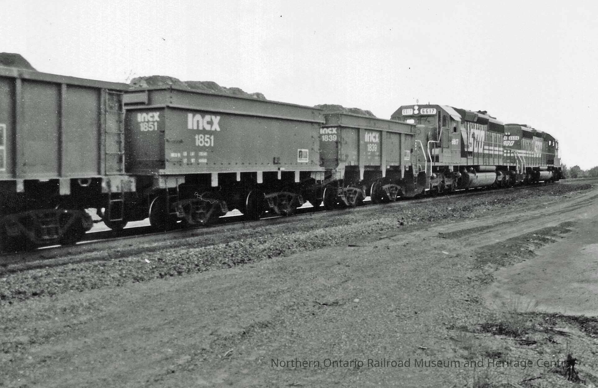 Black and white photograph of a train on the track. "INCX" is stenciled on the railroad cars loaded with Garson ore, attached to locomotive 6617. Photograph taken July 1995.Collection
