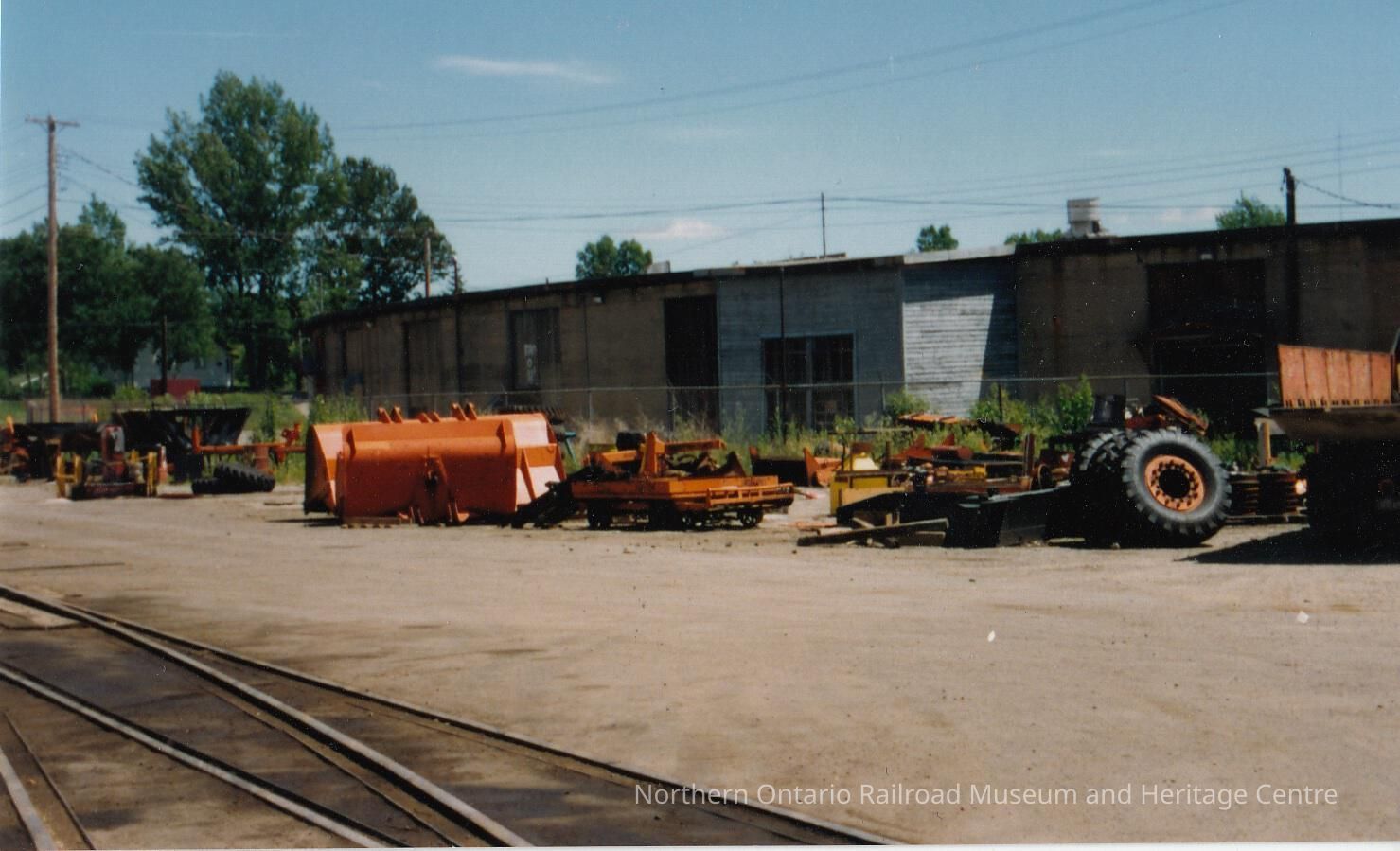 Colour photograph of wheels, trailers and tractor equipment beside a chain link fence in an unidentified railyard. Tracks cross the lower left corner of the photo. Garage in the background behind the chain link fence.