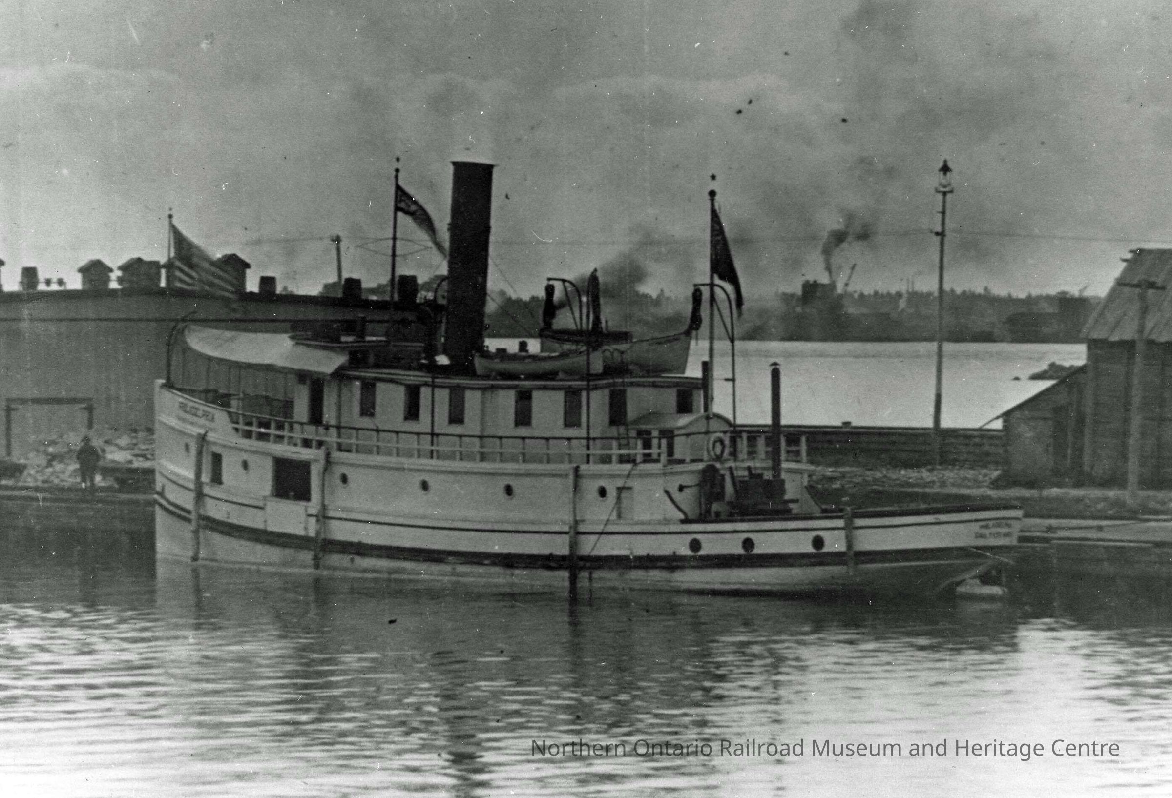 Black and white photograph of tugboat Philadelphia in Sault Ste. Marie and owned by the Lake Superior Company and/or Algoma Central steamships, possibly docked at the [then] Government dock . Two buildings are visible in the middleground on either side of the ship.Collection