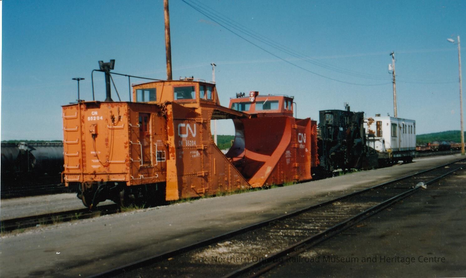 Colour photograph of two CN snow plows facing each other on a track in an unidentified rail yard. Plow to the left is no. 55204.