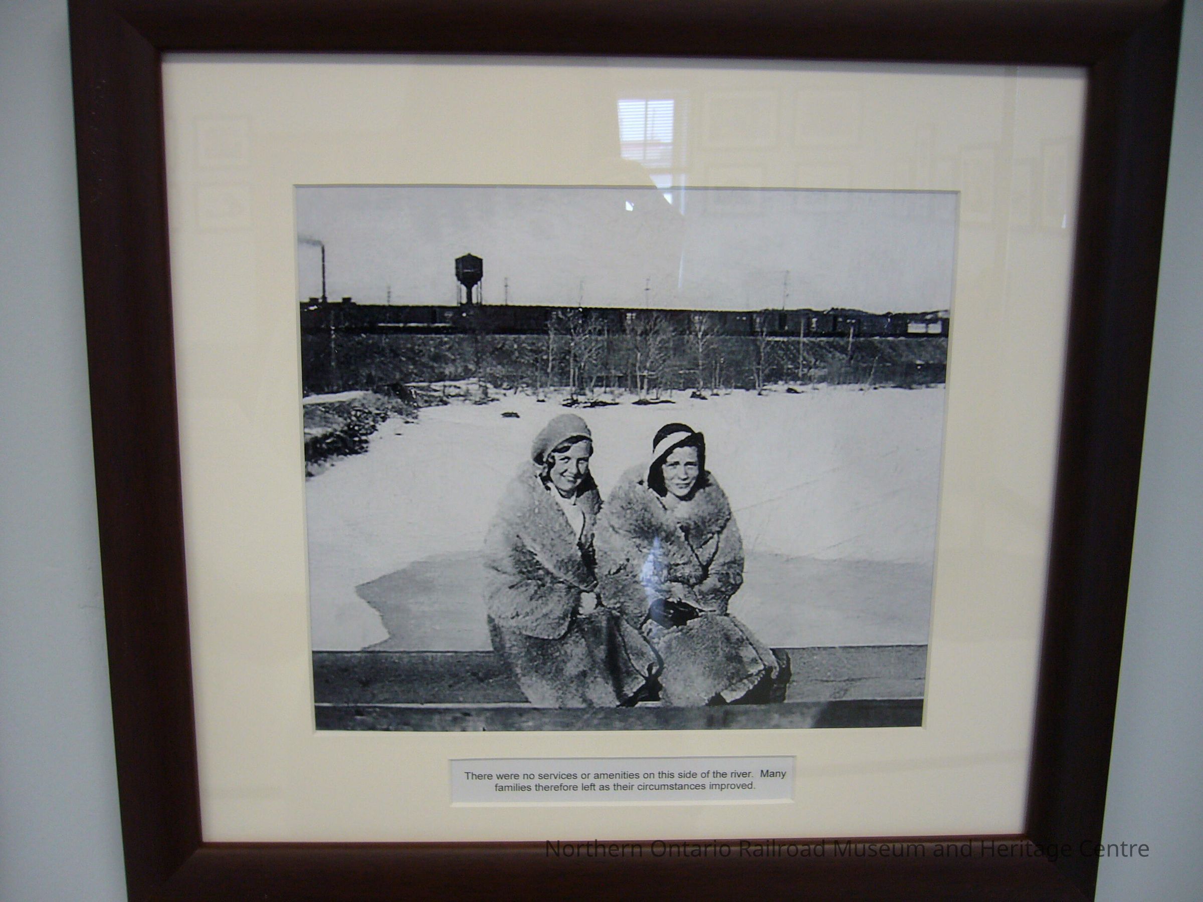 Enlarged reproduction of a black and white photograph of two unidentified women wearing hats and fur coats, seated on a bench or fence on the west bank of the Vermillion River in the winter. A water tower and passing train can be seen in the background. Capreol, Ontario.