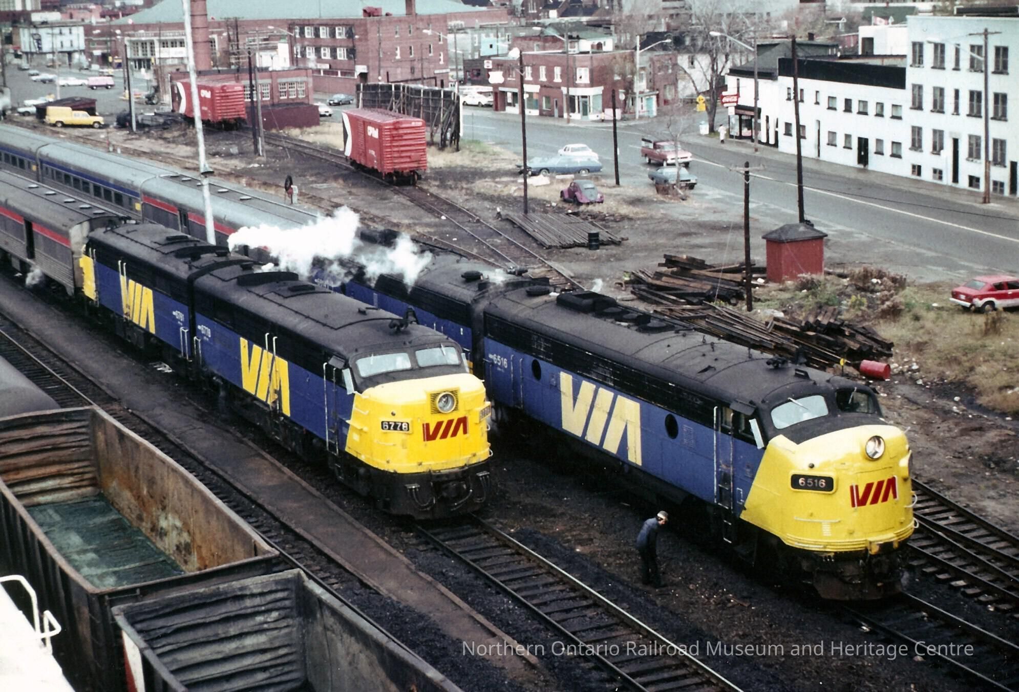 Color photograph of two VIA Rail passenger trains, nos. 6778 and 6516. Photograph taken from above.