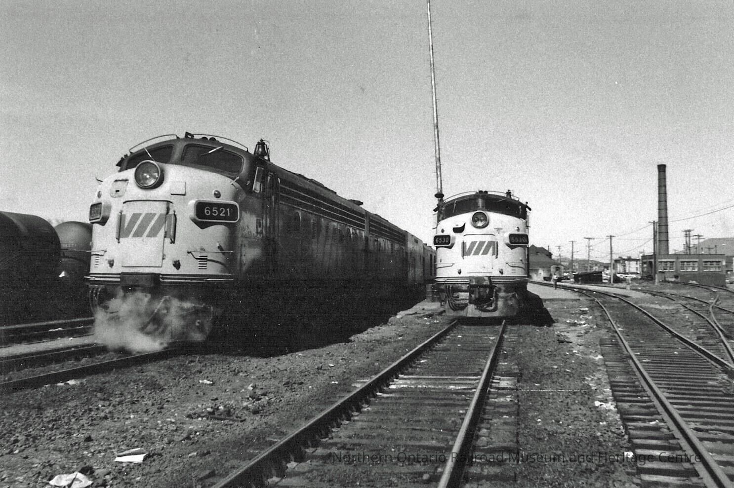 Black and white photograph of two VIA Rail passenger trains in a railroad yard. Locomotive nos. (from left to right) 6521 and 6530. Sudbury, Ontario. Spring 1980.Collection