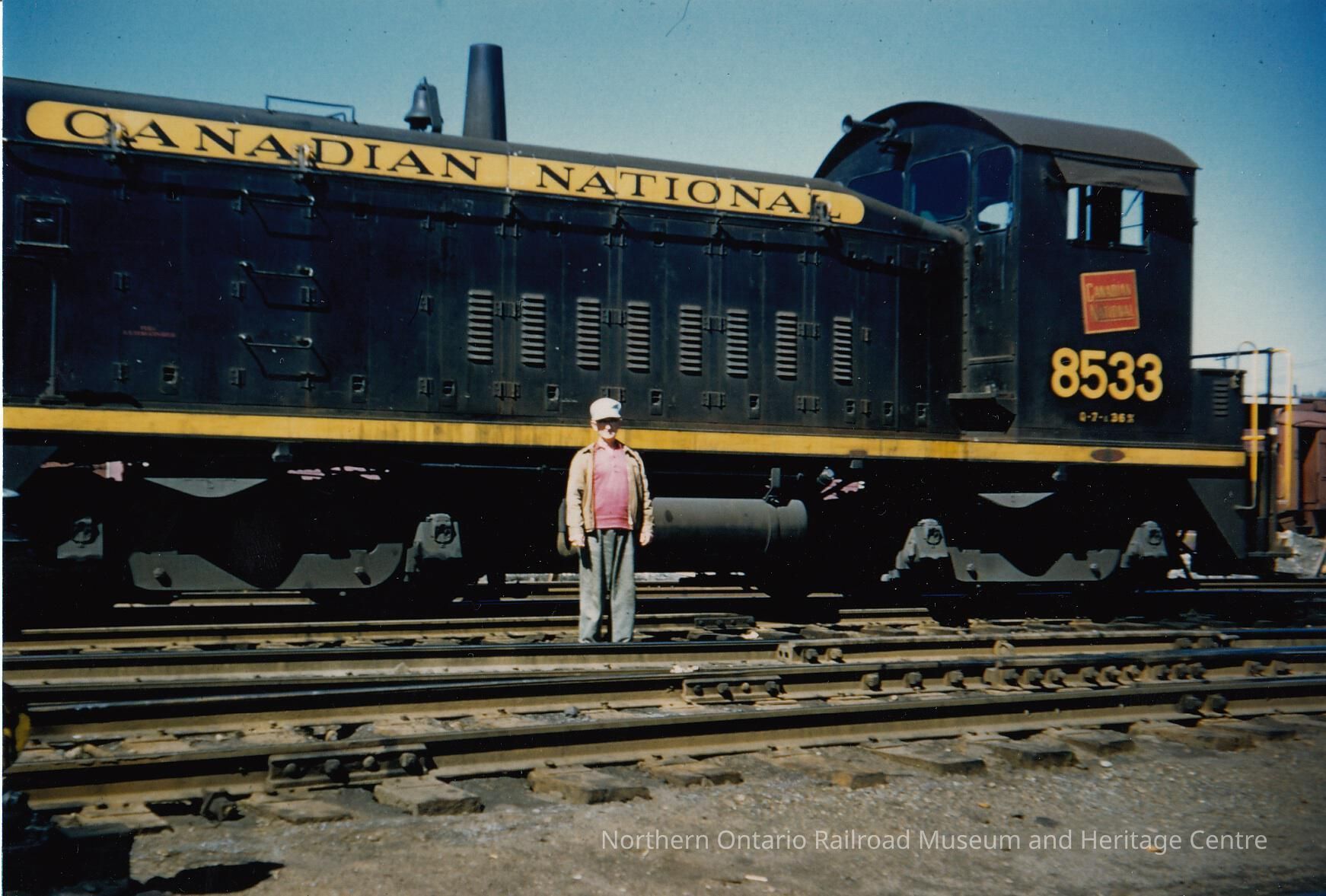 Colour photograph of a man wearing a cap, pink shirt, beige sweater and grey or denim pants, posing in front of Canadian National Railways caboose (?) no. 8533.Collection