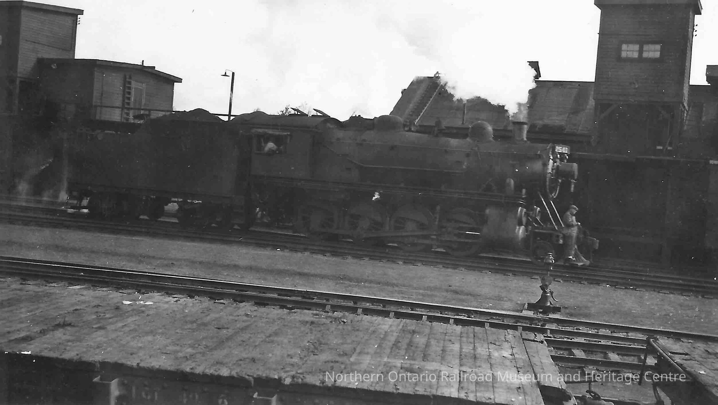 Black and white photograph of steam locomotive No. 2541 probably at servicing facility. Railroad worker standing in front of locomotive.