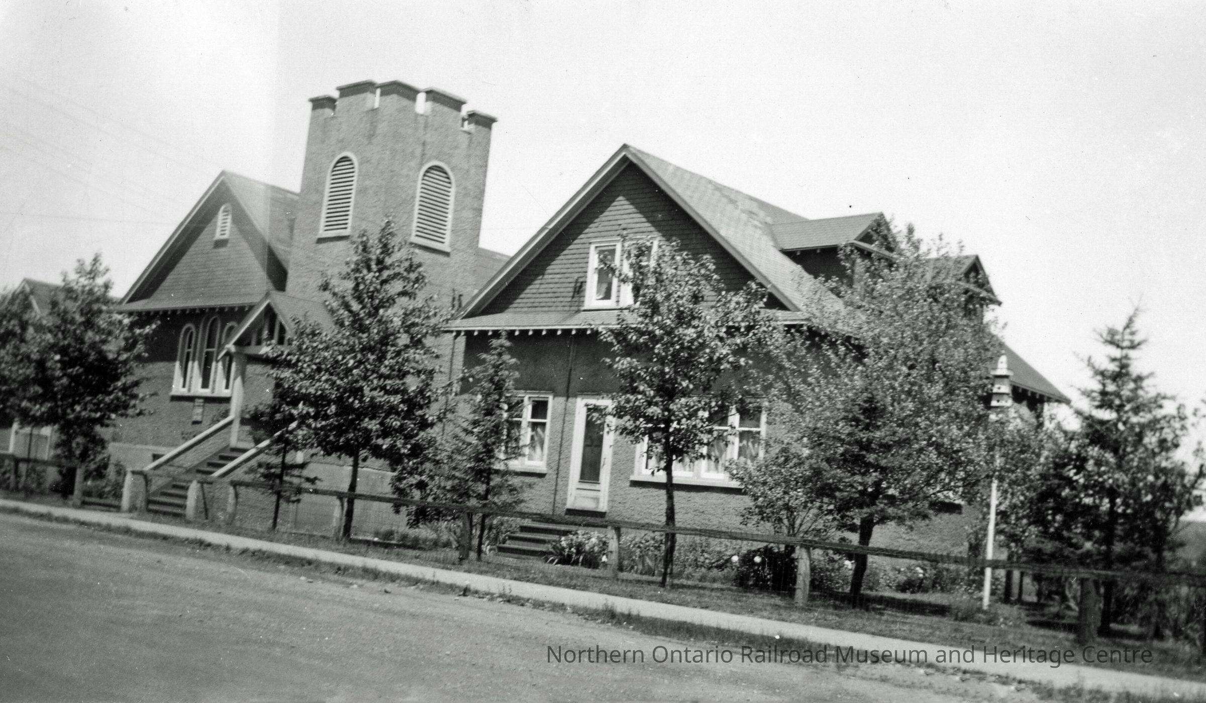 Black and White- A postcard depicting the United Church and Mance. The building on the right is a two story home with a pointed, shingled roof and the building on the left is similar, but with a turreted castle-style tower.Collection