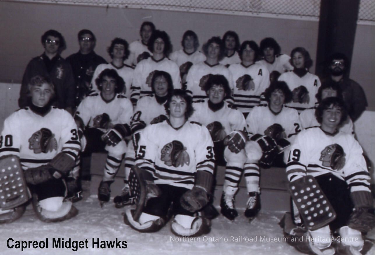 Photograph, Unknown Year, Capreol Midget Hawks. Ken Burns, Mike Ryan, Robbie Mazzuca, Brian Barnicott, Doug Currie, John Hanzel, Todd Grenon, Stephon Edens, Ray Kennedy, Dean Gelinas, Fred Boimistruck, Richard Dubreuil, David Degagne, Tony Marquis, Marty Lusk, Nathan Higgins, Don Cariati, Bruce Miles, Dan Ouellet, Denis Crisp.Collection
