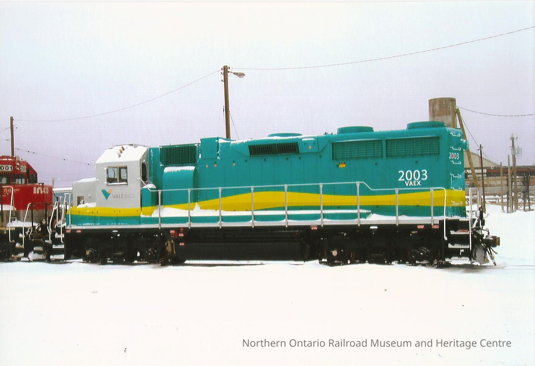Colour photograph of VALE INCO locomotive 2003 in the winter. Painted white, teal and yellow. Locomotive 2003 is facing INCO locomotive 2001, painted red.Collection