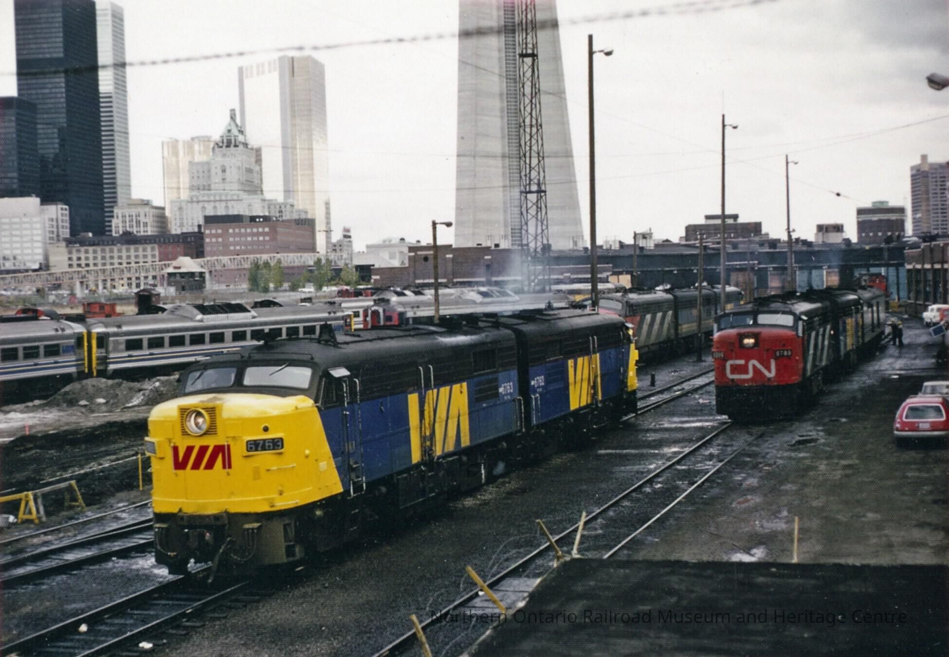 Color photograph of VIA Rail locomotive no. 6763 and CN locomotive no. 6789 in a Toronto railroad yard. Base of CN Tower can be seen near the center of the image.