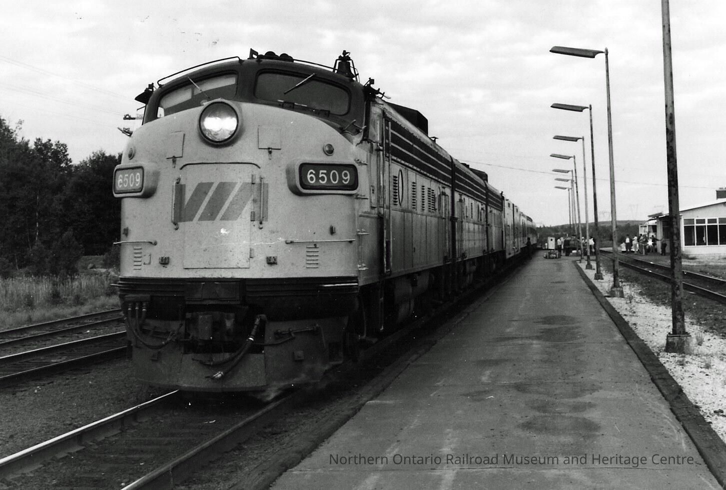 Black and white photograph of VIA Rail's "Canadian" at CN's Sudbury Junction station. Summer 1979.Collection