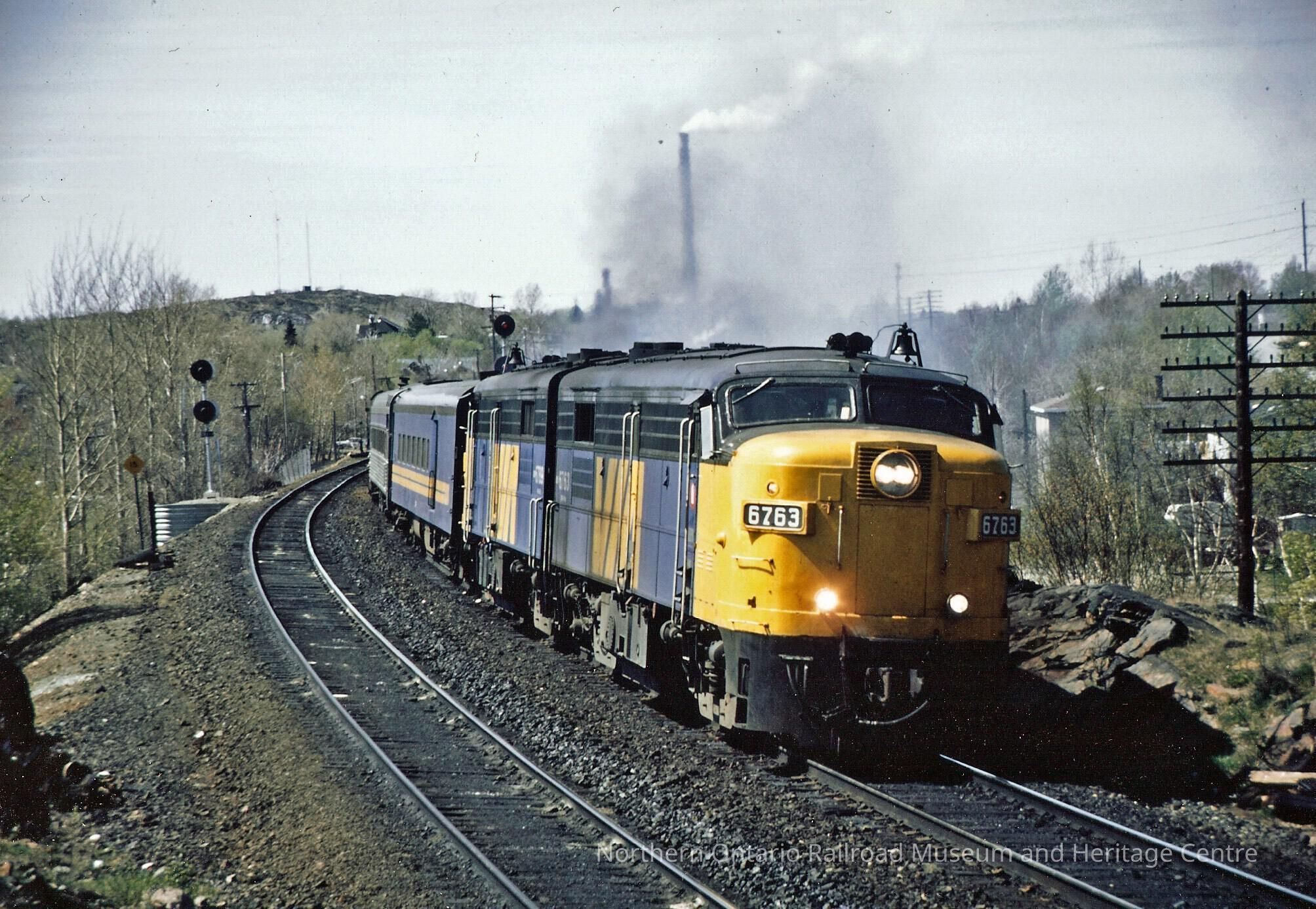 Color photograph of VIA Rail passenger train, locomotive no. 6763.